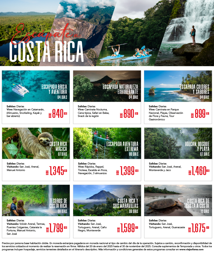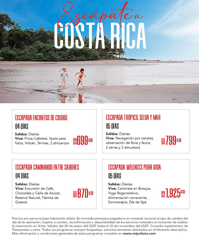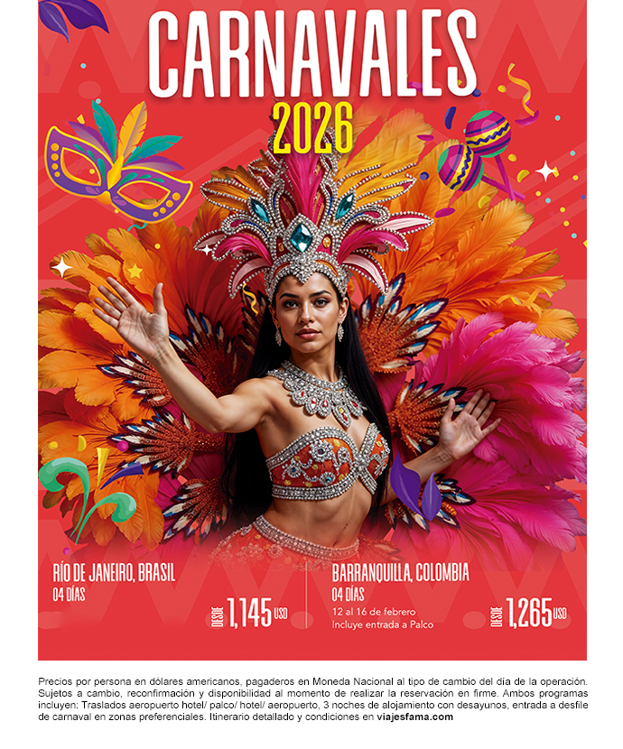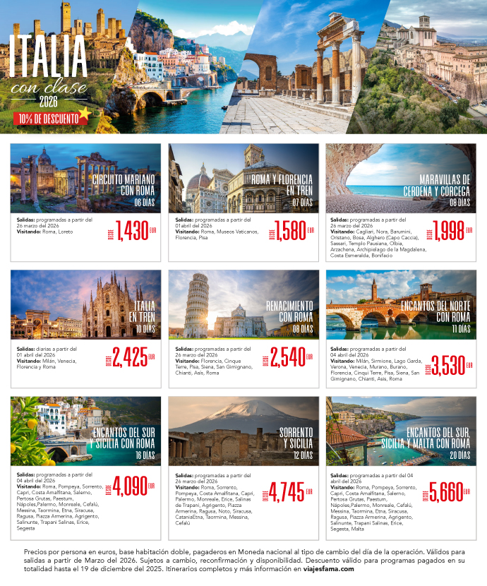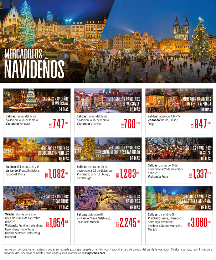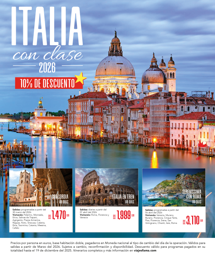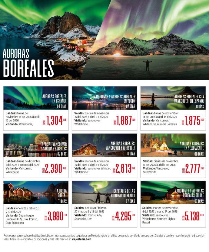 Ofertas en viajes DE VANCOUVER A TORONTO EN THE CANADIAN 7 Días Desde 3,500 USD Visitas: Vancouver, Kamloops, Jasper, Edmonton, Saskatoon, Winnipeg, Sioux Lookout, Toronto Salidas: MIERCOLES Y SABADO NAVIDAD EN LOS CASTILLOS DE LAS ROCOSAS 8 Días Desde 5,385 USD Visitas: Calgary, Lake Louise, Banff Salidas: DICIEMBRE 21 ESPECIAL NAVIDAD Y AÑO NUEVO EN VANCOUVER 7 Días Desde 1,774 USD Visitas: Vancouver, Puente Capilano, Victoria, Whistler Salidas: DIARIAS COSTA A COSTA EN TREN 15 Días Desde 15,997 USD Visitas: Toronto, Niagara Falls, Tren Canadian, Jasper, Vancouver Salidas: DOMINGO AURORAS BOREALES CON VANCOUVER EN ESPAÑOL 6 Días Desde 1,875 USD Visitas: Vancouver, Whitehorse, Auroras Boreales Salidas: DIARIAS SKI BANFF, LAKE LOUISE, SUNSHINE 7 Días Desde 2,124 USD Visitas: Banff, Lake Louise, Sunshine Salidas: DIARIAS MAXIMA EXPERIENCIA 6 Días Desde 1,538 USD Visitas: Montreal, Hotel de Hielo, Quebec, Montreal Salidas: DIARIAS EL SUR DE ESPAÑA Y MARRUECOS 15 Días Desde 2,755 EUR Visitas: Madrid, Córdoba, Sevilla, Ronda, Costa del Sol, Fez, Rabat, Marrakech, Casablanca, Tánger, Tarifa, Algeciras, Granada, Toledo Salidas: Martes SANTUARIOS MARIANOS 13 Días Desde 1,879 USD Visitas: Madrid, Guadalupe, Lisboa, Aljustrel, Fatima, Oporto, Santiago de Compostela, Covadonga, Santander, San Sebastián, Lourdes, Zaragoza Salidas: MIERCOLES SANTA CLAUS Y AURORA BOREAL, FINLANDIA 5 Días Desde 2,175 USD Visitas: Rovaniemi, Paseo Husky, Aldea de Santa Claus, Aurora Boreal Salidas: ESPECIALES ANDRE RIEU EN VIENA 9 Días Desde 1,979 EUR Visitas: Viena, Cena austriaca, Palacio Belvedere, Opera Estatal, Museo de Historia , Parlamento Austriaco, Teatro Nacional, Hofburg, Catedral de San Esteban, Mercado Navideño, Budapest, Plaza de los Héroes, Andrassy, , Opera estatal, Museo Casa del terror, Universidad Hóngara, Iglesia de Matpiasy Bastión de los pescadores, Palacio Real, Brarislava, Praga, Castillo de Hradcany, Catedral de San Vito, Castillo de Praga, Puente de CarlosReloj astronómico, Iglesia Gotica de Nuestra Señora de Tyn, Ciudad Nueva Salidas: NOVIEMBRE 18 PAPA NOEL EN MONTREUX 4 Días Desde 1,080 EUR Visitas: Ginebra, Montreux, Lago Lemán, Rochers de Naye, Catillo Chillón, Salidas: MARTES, MIERCOLES, JUEVES, VIERNES, SABADO MERCADOS NAVIDEÑOS 7 Días Desde 1,442 EUR Visitas: Frankfurt, Rotemburgo ob der Tauber, Núremberg, Dresde, Berlín Salidas: DICIEMBRE 06 CASTILLOS DEL LOIRA Y PARIS 8 Días Desde 1,900 USD Visitas: París, chartres, Nantes, Tours, Amboise, Chononceau, Fontevraud, Azay le Rideau, Villandry, Blois, París Salidas: SABADO FIN DE AÑO EN EUROPA DEL ESTE 9 Días Desde 2,183 EUR Visitas: Praga, Budapest, Viena Salidas: ESPECIAL SANTUARIOS ITALIANOS JUBILEO 2025 10 Días Desde 1,665 EUR Visitas: Roma, Florencia, Venecia, Padua, Loreto, Asis, Cascia, Lanciano, Monte Sant´Angelo, San Giovanni Rotondo, Pompeya, Roma Salidas: SABADOS LUNA DE MIEL, SINGAPUR Y MALASIA PARA DOS 9 Días Desde 1,980 USD Visitas: Singapur, Kuala Lumpur y Redang Salidas: DIARIAS TAILANDIA A TU ALCANCE 8 Días Desde 995 USD Visitas: Bangkok, Ayutthaya, Ang Thong, Phitsanulok, Sukhothai, Chiang Rai, Triangulo de Oro, Chiang Mai Salidas: MARTES TURQUIA PARA TODOS 10 Días Desde 890 EUR Visitas: Estambul, Ankara, Capadocia, Pamukkale, Efeso, Izmir, Kusadasi, Pergamo y Estambul Salidas: Jueves EL TESORO DE LA INDIA 17 Días Desde 3,433 USD Visitas: Mumbai, Udaipur, Ranakpur, Jodhpur, Jaisalmer, Khuri, Jaisalmer, Bikaner, Jaipur, Amber, Fatehpur Sikri, Agra, Jhansi, Orcha, Khajuraho, Varanasi, Delhi Salidas: DIARIAS GRAN TOUR DE INDOCHINA 18 Días Desde 5,180 USD Visitas: Bangkok, Kanchanaburi (Río Kwai), Ayutthaya, Ang Thong, Phitsanulok, Sukhothai, Chiang Rai, Chiang Mai, Siem Reap, Kuala Lumpur, Singapur Salidas: LUNES Y MARTES BUTAN-LA TIERRA DE LA FELICIDAD 6 Días Desde 2,623 USD Visitas: Paro, Thimpu, Punakha, Paro Salidas: DIARIAS FANTASIA DE JORDANIA 2026 8 Días Desde 1,384 USD Visitas: Amman, Ajlun, Jerash, Betania, Madaba, MT Nebo, Petra, Pequeña Petra, Aqaba, Wadi Rum, Umm Ar Rasas, Mar Muerto, Amman Salidas: DIARIAS VIAJE AL CAUCASO, AZERBAIYAN, GEORGIA Y ARMENIA 13 Días Desde 3,449 USD Visitas: Baku, Gobustán, Absherón, Shamaja, Sheki, Lagodeji, Región de Kajetia, Tiblisi, Mtsjeta, Gori, Uplistsije, Gudauri, Stepantsminda, Sadajlo, Haghpat, Saghmosavank, Ereván, Echmiadzin, Zvartnots, Khor Virap, Noravank, Sevan, Garni, Gueghard, Ereván Salidas: DOMINGO SUPER JAPON 10 Días Desde 3,170 USD Visitas: Osaka, Kioto, Magome, Tsumago, Takayama, Shirakawago, Hakone y Tokio Salidas: MARTES, MIERCOLES, JUEVES, VIERNES EGIPTO Y EL MAR ROJO 12 Días Desde 2,472 USD Visitas: El Cairo, Piramides de Giza, Aswan, Abu Simbel, Kon Ombo, Edfu, Luxor, Valle de los Reyes, Hurghada, El Cairo Salidas: JUEVES EGIPTO Y EL MISTICO SINAI 12 Días Desde 2,625 USD Visitas: El Cairo, Piramides de Giza, Aswan, Abu Simbel, Kom Ombo, Edfu, Luxor, Esna, Sharm El Sheikh, El Cairo Salidas: JUEVES LO MEJOR DE JORDANIA 2026 8 Días Desde 1,384 USD Visitas: Ammán, Ajlun, Jerash, betania, Madaba, Mt. Nebo, Petra, Pequeña Petra, Aqaba, Wadi Rum, Umm Ar Rasas, Mar Muerto, Amman Salidas: DIARIAS PRIMATES EN UGANDA 7 Días Desde 3,219 USD Visitas: Entebbe, Kampala, Kigo, Fort Portal, Kibale N.P., Queen Elizabeth N.P.,Ishasha, Bwindi Impenetrable N.P., Entebbe Salidas: LUNES PANORAMA DUBAI Y OMAN 9 Días Desde 2,997 USD Visitas: Moscat, Mezquita Sultán Qaboos, Gran Mezquita, Royal Opera House, Museo Bait Al Baranda, Mutttah Souk, Palacio Al Alam, Fabrica de Amouage, Nizwa, Bahla Fort, Jambreen, Nizwa, Jabel Akhdar, Wadi Bani Khalid, Wahiba, Dubai, Bastakia Salidas: DIARIAS SECRETOS DE OMAN I 6 Días Desde 1,247 USD Visitas: Muscat, Jabreen, Bahla, Hamra, Nizma, Wadi Bani Khalid, Wahiba Sands, Bimmah Sinkhole, Muscat Salidas: ESPECIALES CHINA EN TREN DE ALTA VELOCIDAD 9 Días Desde 2,081 USD Visitas: Beijing, Hangzhou, Suzhou, Shanghai Salidas: SABADO CRUCERO PERLAS DE ARABIA 8 Días Desde 2,285 USD Visitas: Do